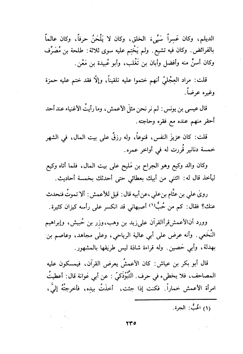الدَّيْلَمِ، وَكَانَ عَسِراً، سَيِّئَ الخُلُقِ، وَكَانَ لاَ يَلحَنُ حَرفاً، وَكَانَ عَالِماً بِالفَرَائِضِ، وَكَانَ فِيْهِ تَشَيُّعٌ، وَلَمْ يَخْتِمْ عَلَيْهِ سِوَى ثَلاَثَةٍ: طَلْحَةُ بنُ مُصَرِّفٍ - وَكَانَ أَسَنَّ مِنْهُ وَأَفَضْلَ - وَأَبَانُ بنُ تَغْلِبَ، وَأَبُو عُبَيْدَةَ بنُ مَعْنٍ.