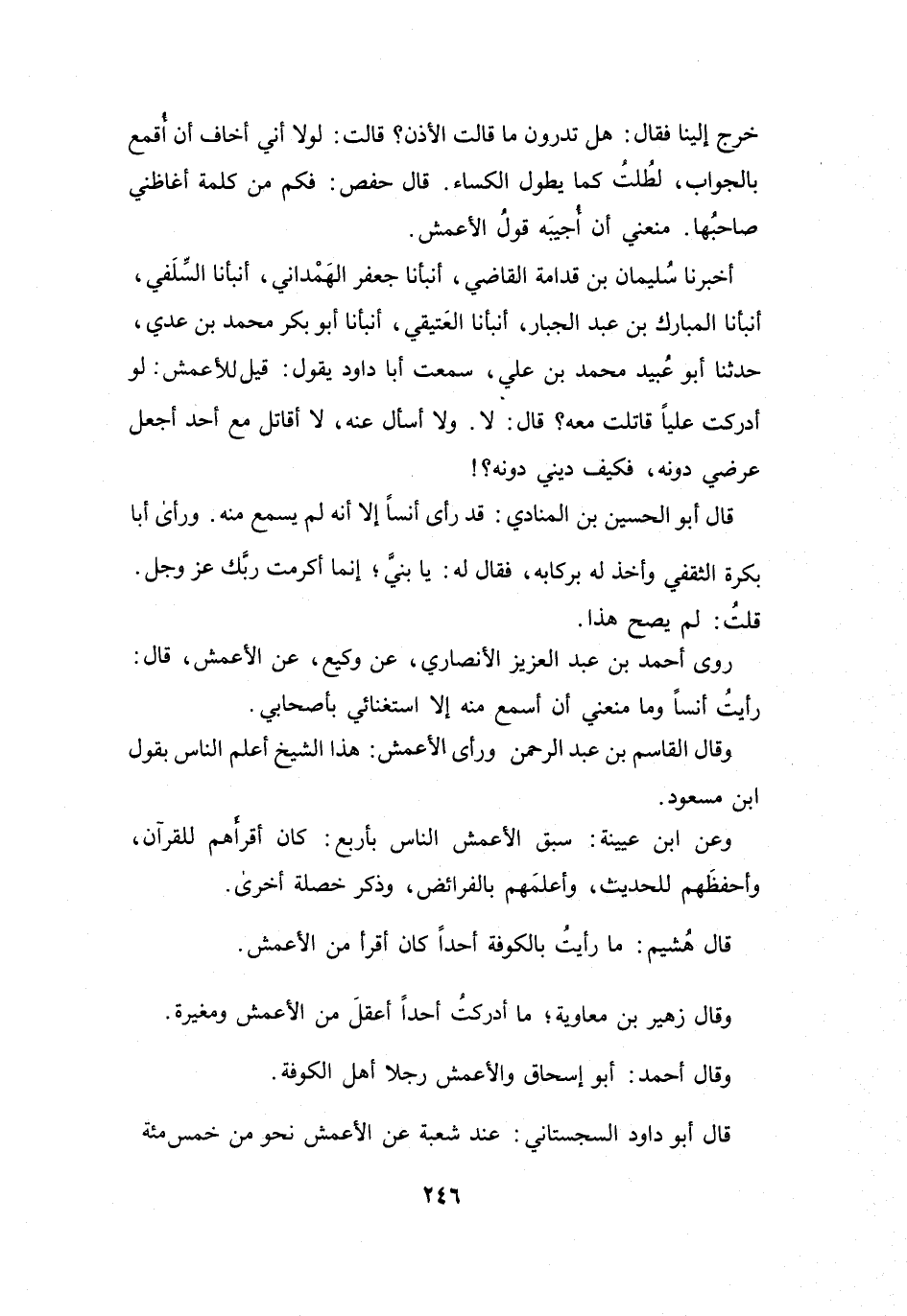 قَالَ هُشَيْمٌ: مَا رَأَيْتُ بِالكُوْفَةِ أَحَداً كَانَ أَقْرَأَ مِنَ الأَعْمَشِ.