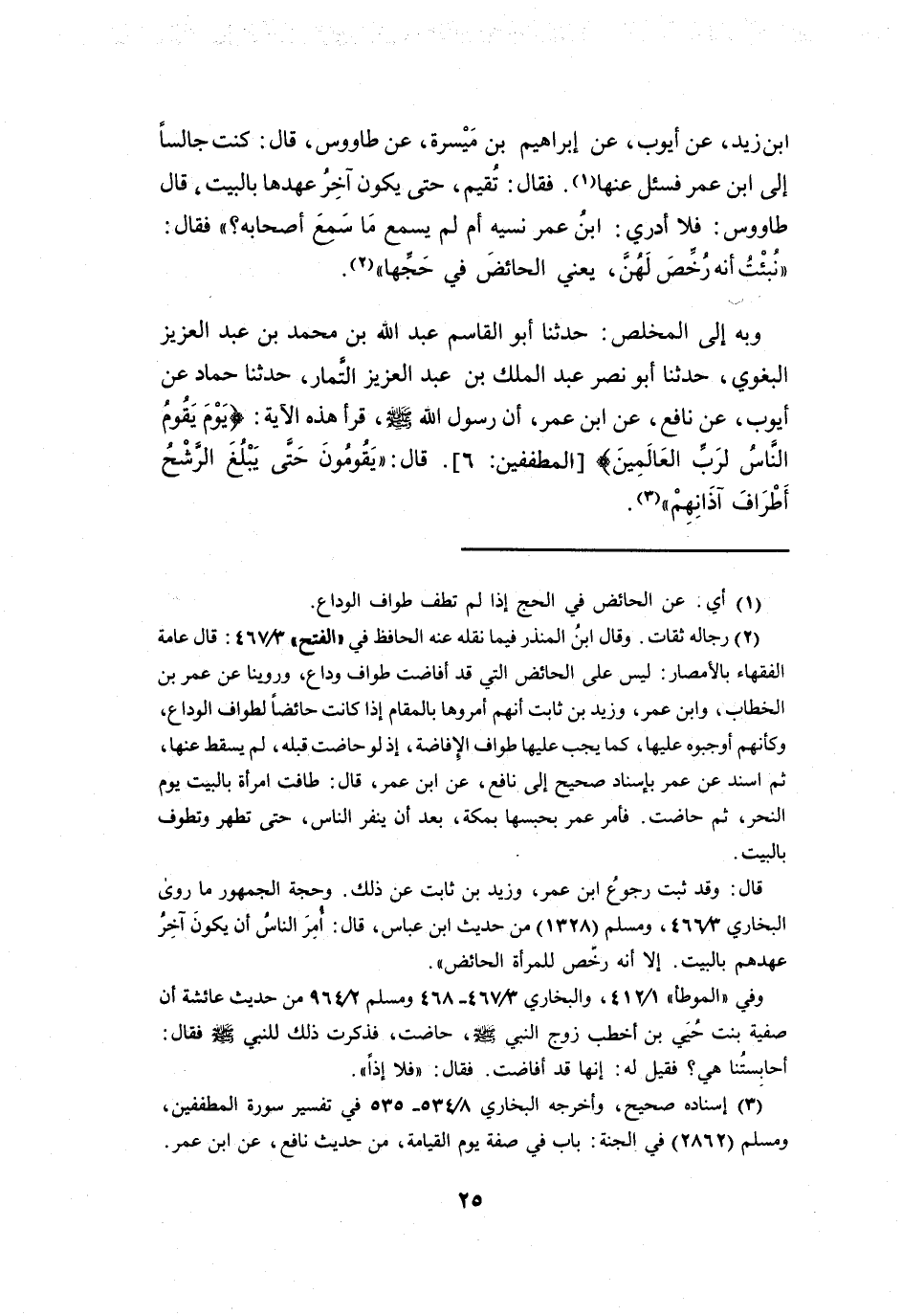 وقال ابن المنذر فيما نقله عنه الحافظ في " الفتح " 3 / 467: قال عامة الفقهاء بالامصار: ليس على الحائض التي قد أفاضت طواف وداع، وروينا عن عمر بن الخطاب، وابن عمر، وزيد بن ثابت أنهم أمروها بالمقام إذا كانت حائضا طواف الوداع، وكأنهم أوجبوه عليها، كما يجب عليها طواف الافاضة، إذ لو حاضت قبله، لم يسقط عنها، ثم اسند عن عمر بإسناد صحيح إلى نافع، عن ابن عمر، قال: طافت امرأة بالبيت يوم النحر، ثم حاضت.