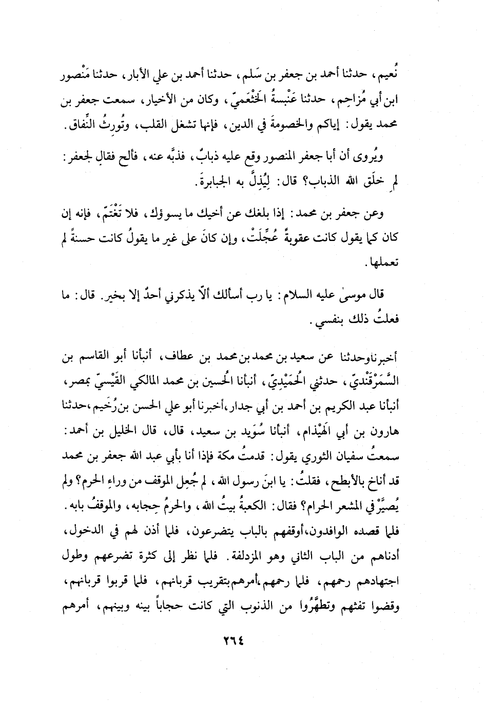 قَدِمْتُ مَكَّةَ، فَإِذَا أَنَا بِأَبِي عَبْدِ اللهِ جَعْفَرِ بنِ مُحَمَّدٍ قَدْ أَنَاخَ بِالأَبْطَحِ، فَقُلْتُ: يَا ابْنَ رَسُوْلِ اللهِ! لِمَ جُعِلَ المَوْقِفُ مِنْ وَرَاءِ الحَرَمِ، وَلَمْ يُصَيَّرْ فِي المَشْعَرِ الحَرَامِ؟