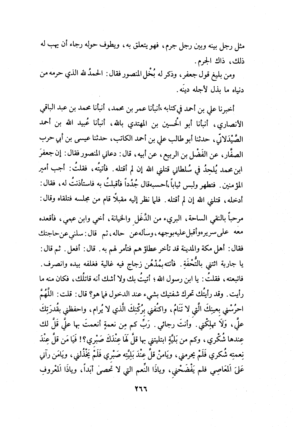 وَمِنْ بَلِيْغِ قَوْلِ جَعْفَرٍ، وَذُكِرَ لَهُ بُخلُ المَنْصُوْرِ، فَقَالَ: الحَمْدُ للهِ الَّذِي حَرَمَه مِنْ دُنْيَاهُ، مَا بَذَلَ لأَجَلِه دِيْنَهُ.