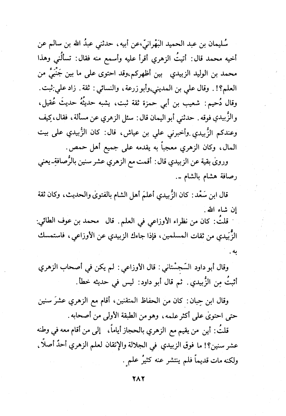 قُلْتُ: أَيْنَ مَنْ يُقِيْمُ مَعَ الزُّهْرِيِّ بِالحِجَازِ أَيَّاماً، إِلَى مَنْ أَقَامَ مَعَهُ فِي وَطَنِه عَشرَ سِنِيْنَ؟! مَا فَوْقَ الزُّبَيْدِيِّ فِي الجَلاَلَةِ وَالإِتقَانِ لِعِلْمِ الزُّهْرِيِّ أَحَدٌ أَصلاً، وَلَكِنَّهُ مَاتَ قَدِيْماً، فَلَمْ يَنتَشِرْ عَنْهُ كَثِيْرُ عِلْمٍ.
