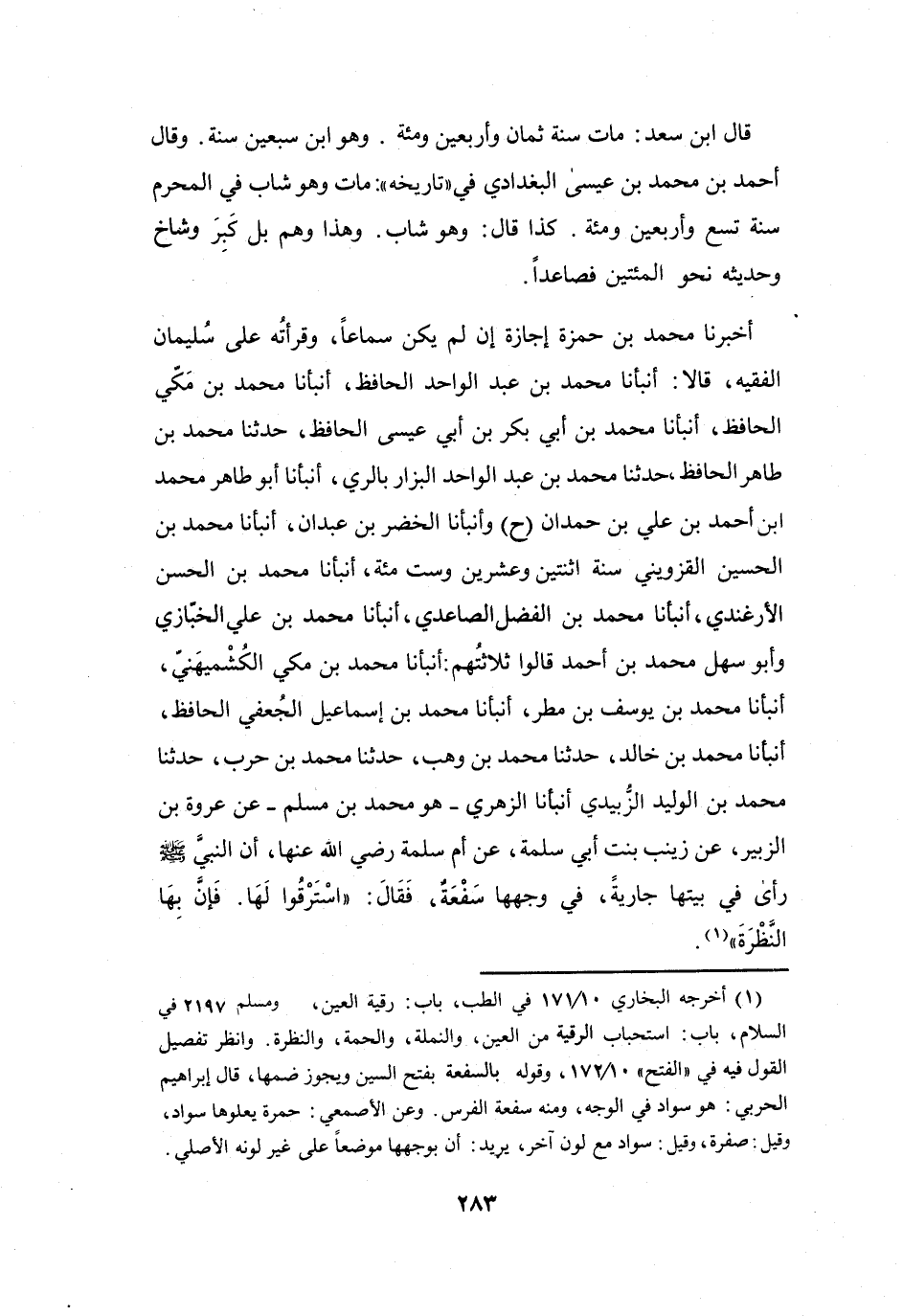 أَنْبَأَنَا مُحَمَّدُ بنُ مَكِّيٍّ الكُشْمِيْهَنِيُّ، أَنْبَأَنَا مُحَمَّدُ بنُ يُوْسُفَ بنِ مَطَرٍ، أَنْبَأَنَا مُحَمَّدُ بنُ إِسْمَاعِيْلَ الجُعْفِيُّ الحَافِظُ، أَنْبَأَنَا مُحَمَّدُ بنُ خَالِدٍ، حَدَّثَنَا مُحَمَّدُ بنُ وَهْبٍ، حَدَّثَنَا مُحَمَّدُ بنُ حَرْبٍ، حَدَّثَنَا مُحَمَّدُ بنُ الوَلِيْدِ الزُّبَيْدِيُّ، أَنْبَأَنَا الزُّهْرِيُّ - هُوَ مُحَمَّدُ بنُ مُسْلِمٍ - عَنْ عُرْوَةَ بنِ الزُّبَيْرِ، عَنْ زَيْنَبَ بِنْتِ أَبِي سَلَمَةَ، عَنْ أُمِّ سَلَمَةَ - رَضِيَ اللهُ عَنْهَا -: