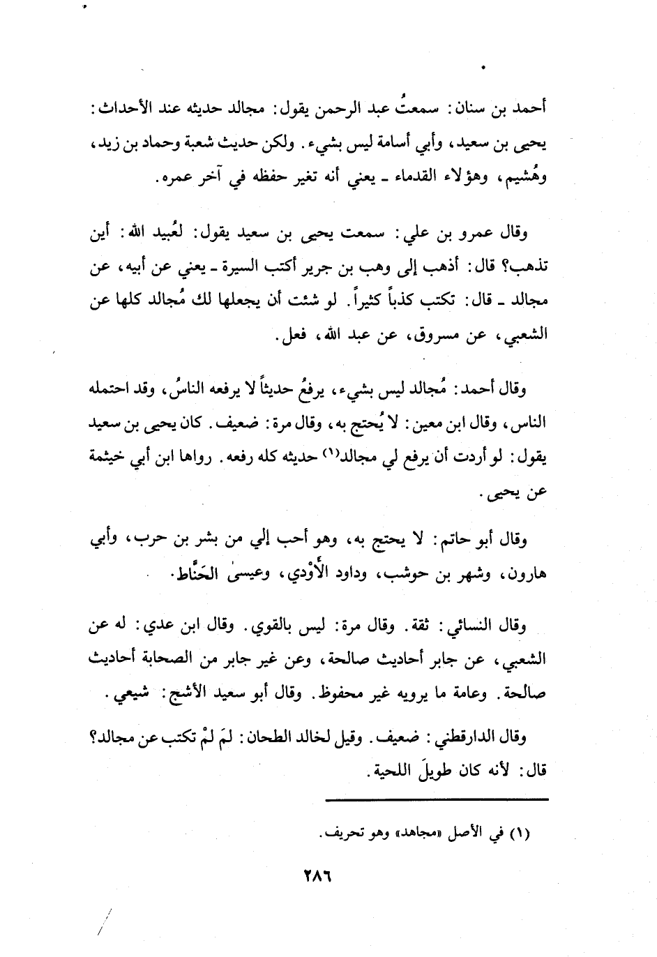 مُجَالِدٌ حَدِيْثُه عِنْدَ الأَحْدَاثِ؛ يَحْيَى بنِ سَعِيْدٍ، وَأَبِي أُسَامَةَ، لَيْسَ بِشَيْءٍ، وَلَكِنْ حَدِيْثُ شُعْبَةَ، وَحَمَّادِ بنِ زَيْدٍ، وَهُشَيْمٍ، وَهَؤُلاَءِ القُدَمَاءِ -يَعْنِي: أَنَّهُ تَغَيَّرَ حِفْظُهُ فِي آخِرِ عُمُرِهِ-.
