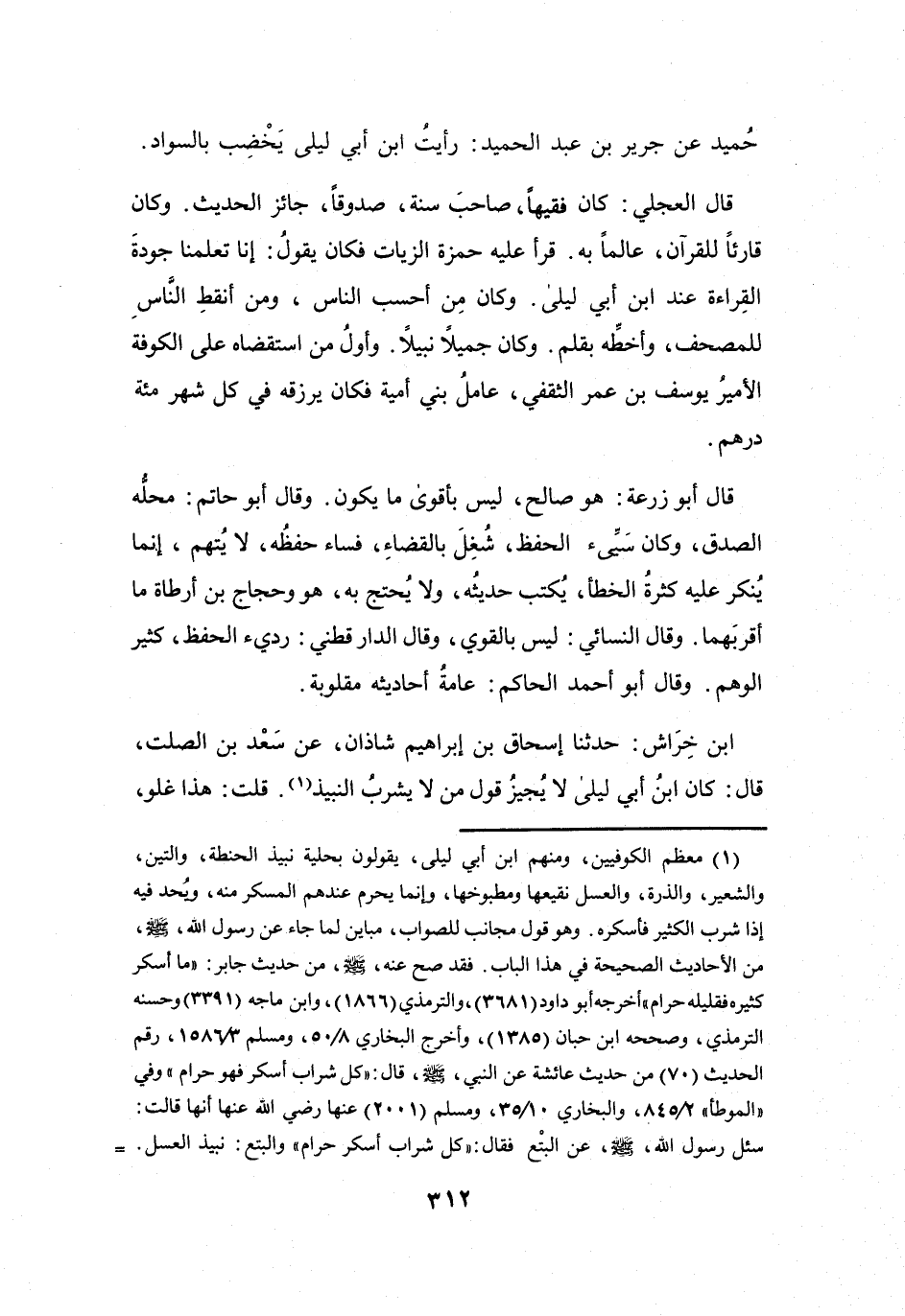 ابْنُ خِرَاشٍ: حَدَّثَنَا إِسْحَاقُ بنُ إِبْرَاهِيْمَ شَاذَانَ، عَنْ سَعْدِ بنِ الصَّلْتِ، قَالَ: كَانَ ابْنُ أَبِي لَيْلَى لاَ يُجِيْزُ قَوْلَ مَنْ لاَ يَشْرَبُ النَّبِيْذَ (1) .
