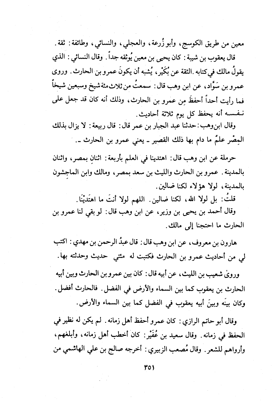 سَمِعْتُ مِنْ ثَلاَثِ مائَةِ شَيْخٍ وَسَبْعِيْنَ شَيْخاً، فَمَا رَأَيْتُ أَحَداً أَحْفَظَ مِنْ عَمْرِو بنِ الحَارِثِ، وَذَلِكَ أَنَّهُ كَانَ قَدْ جَعَلَ عَلَى نَفْسِهِ أَنَّهُ يَحْفَظُ كُلَّ يَوْمٍ ثَلاَثَةَ أَحَادِيْثَ.