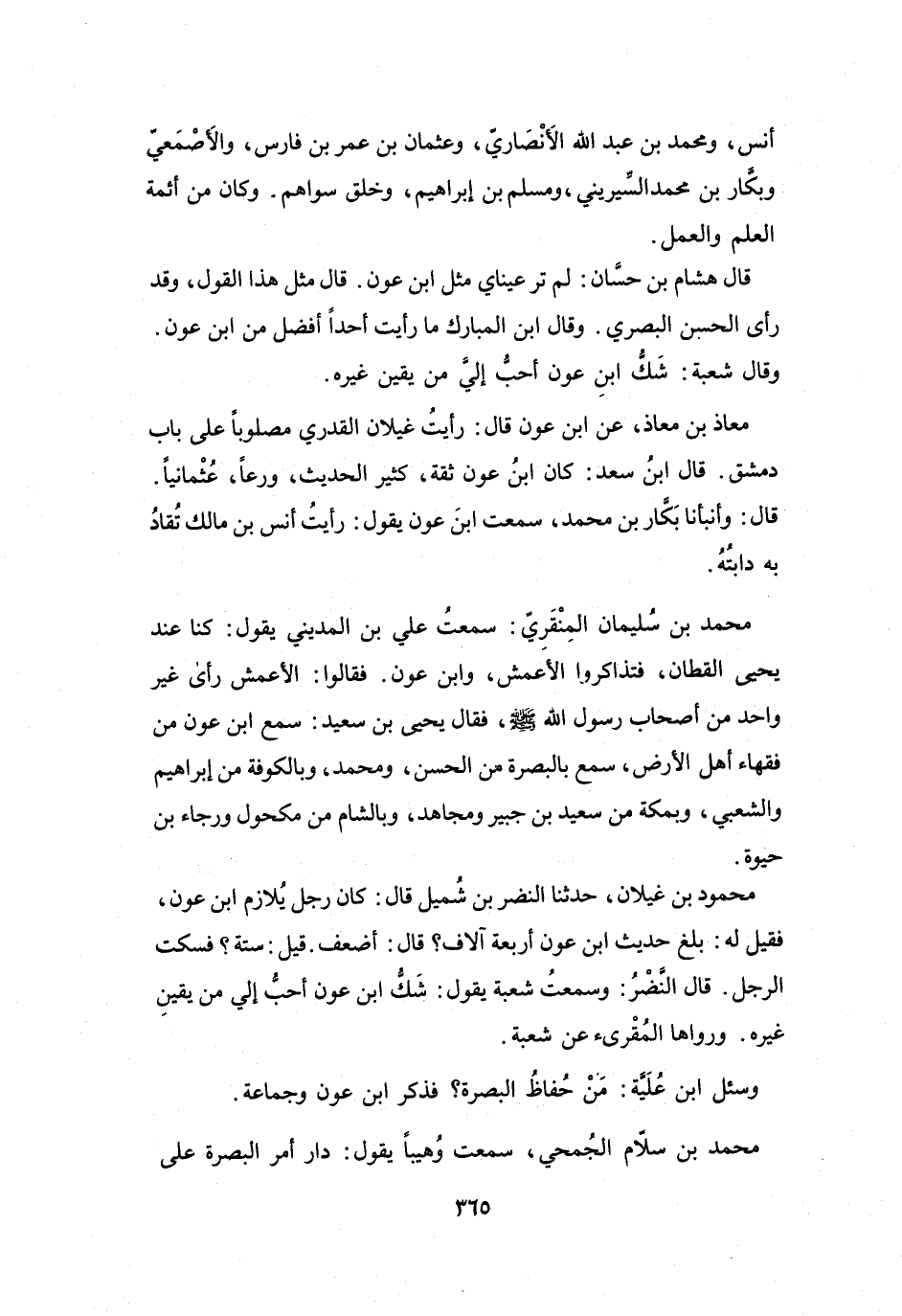 قَالَ النَّضْرُ: وَسَمِعْتُ شُعْبَةَ يَقُوْلُ: شكُّ ابْنِ عَوْنٍ أَحَبُّ إِلَيَّ مِنْ يَقِيْنِ غَيْرِه.