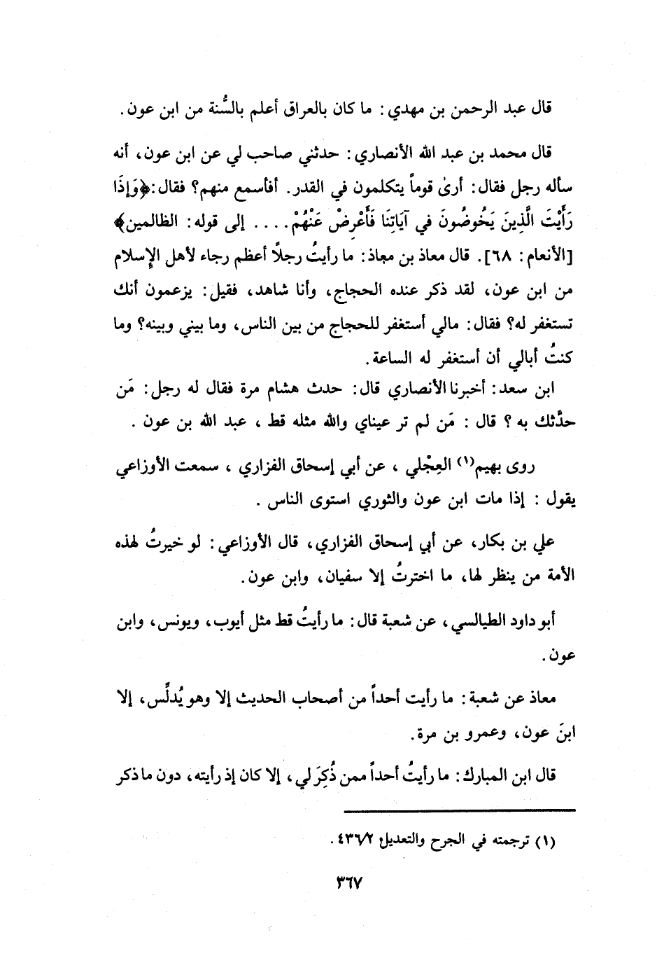 قَالَ عَبْدُ الرَّحْمَنِ بنُ مَهْدِيٍّ: مَا كَانَ بِالعِرَاقِ أَعْلَمَ بِالسُّنَّةِ مِنِ ابْنِ عَوْنٍ.
