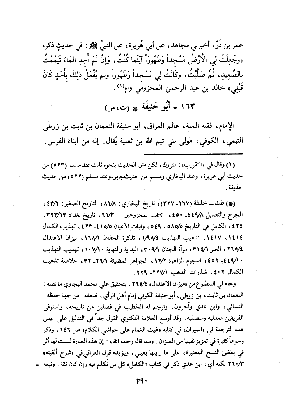 وجاء في المطبوع من " ميزان الاعتدال " 4 / 265، بتحقيق علي محمد البجاوي مانصه: النعمان بن ثابت، بن زوطى، أبو حنيفة الكوفي إمام أهل الرأي، ضعفه من جهة حفظه النسائي، وابن عدي وآخرون، وترجم له الخطيب في فصلين من تاريخه، واستوفى الفريقين معدليه ومنصفيه.
