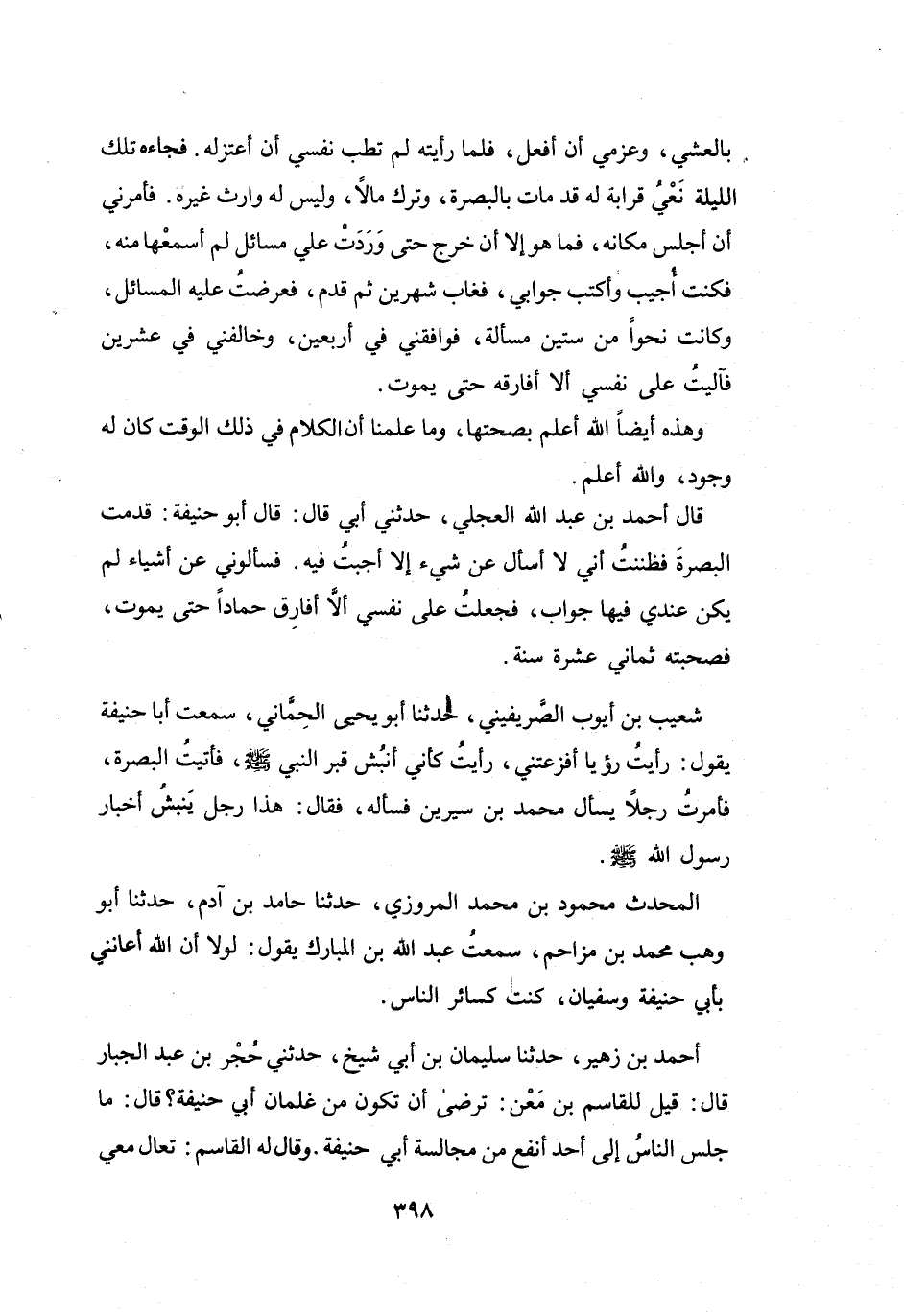 قَالَ أَبُو حَنِيْفَةَ: قَدِمْتُ البَصْرَةَ، فَظَنَنْتُ أَنِّي لاَ أُسْأَلُ عَنْ شَيْءٍ إِلاَّ أَجَبتُ فِيْهِ، فَسَأَلُونِي عَنْ أَشْيَاءَ لَمْ يَكُنْ عِنْدِي فِيْهَا جَوَابٌ، فَجَعَلتُ عَلَى نَفْسِي أَلاَّ أُفَارِقَ حَمَّاداً حَتَّى يَمُوْتَ، فَصَحِبتُه ثَمَانِيَ عَشْرَةَ سَنَةً.
