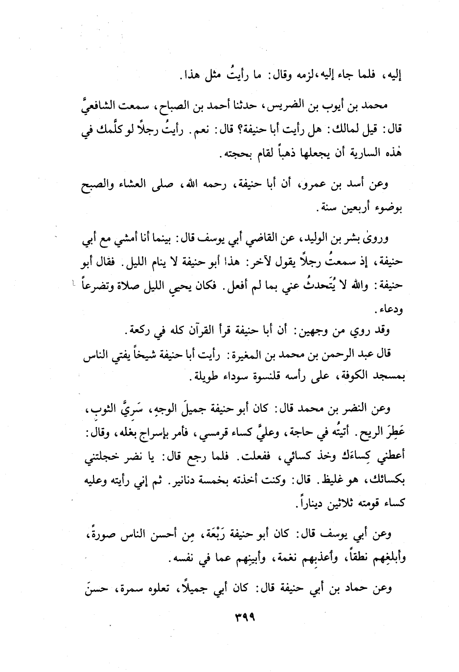 بَيْنَمَا أَنَا أَمشِي مَعَ أَبِي حَنِيْفَةَ، إِذْ سَمِعْتُ رَجُلاً يَقُوْلُ لآخَرَ: هَذَا أَبُو حَنِيْفَةَ لاَ يَنَامُ اللَّيلَ.