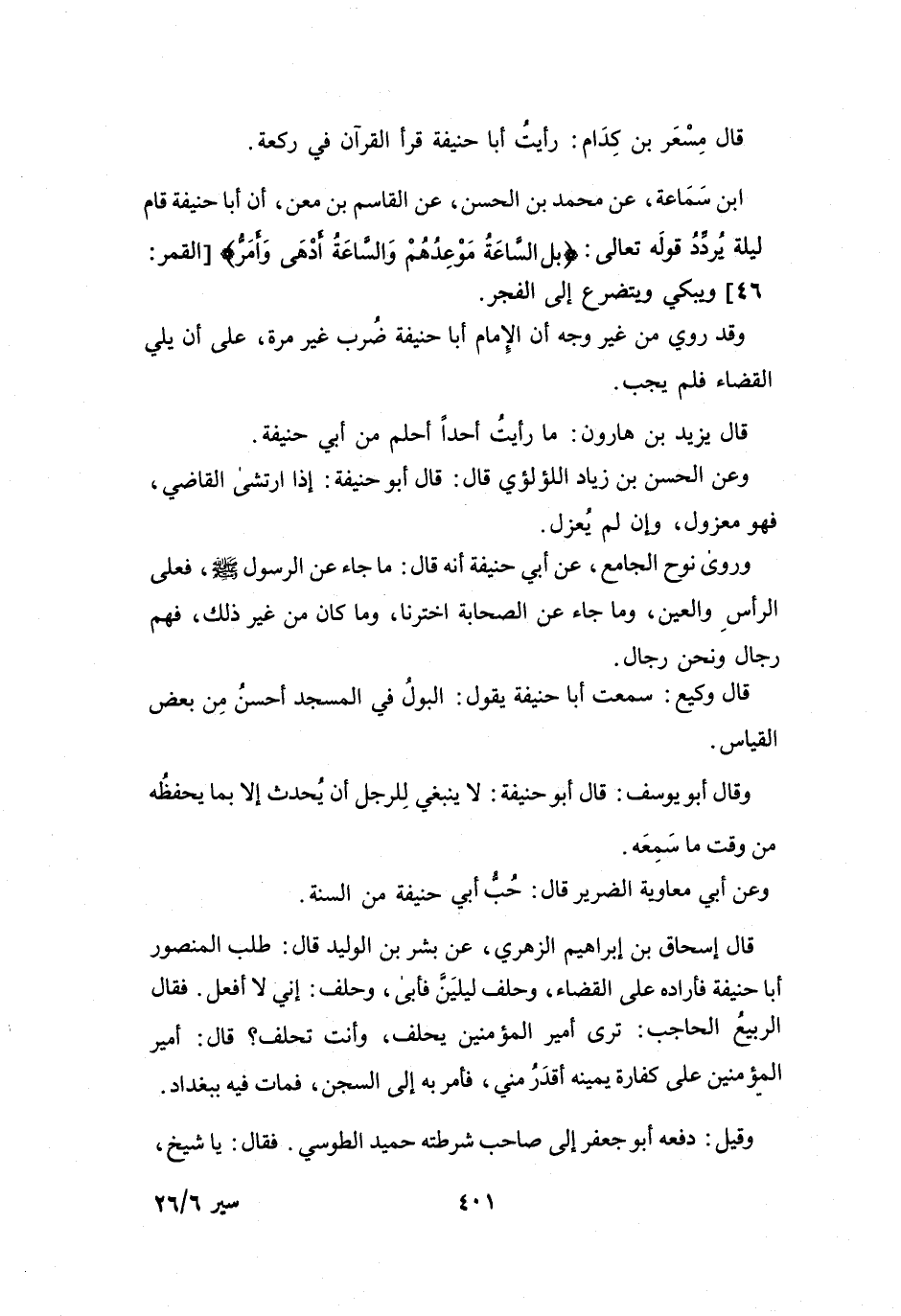 أَنَّ أَبَا حَنِيْفَةَ قَامَ لَيْلَةً يُرَدِّدُ قَوْلَه تَعَالَى: {بَلِ السَّاعَةُ مَوْعِدُهُمْ، وَالسَّاعَةُ أَدْهَى وَأَمَرُّ} [القَمَرُ: 46] ، وَيَبْكِي، وَيَتَضَرَّعُ إِلَى الفَجْرِ.