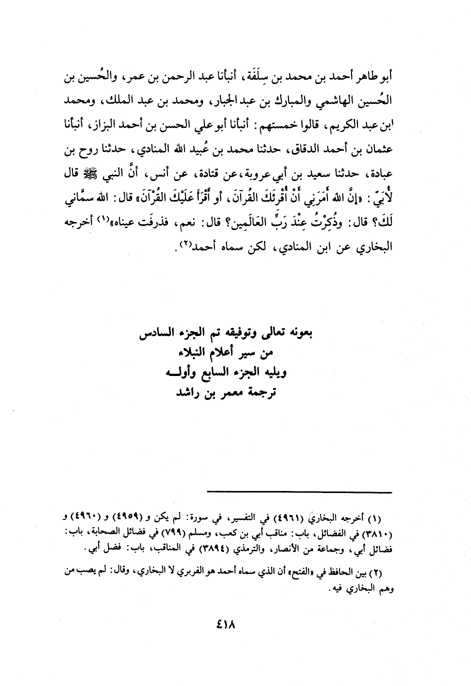 بِعَوْنِهِ -تَعَالَى- وَتَوفِيْقِه تَمَّ الجُزْءُ السَّادِسُ مِنْ (سِيَرِ أَعْلاَمِ النُّبَلاَءِ) .