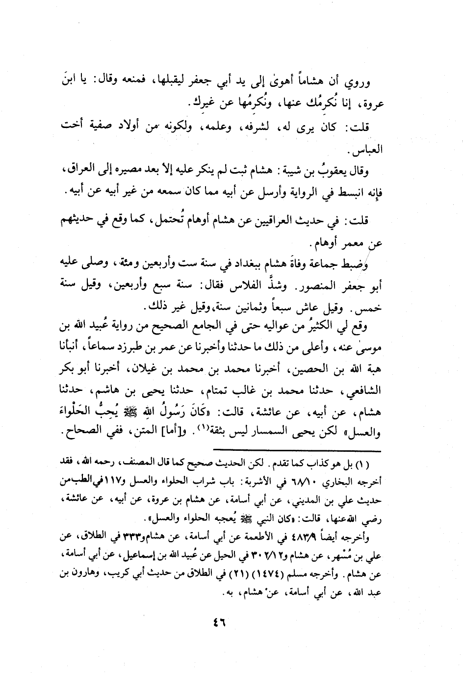 لكن الحديث صحيح كما قال المصنف، رحمه الله، فقد أخرجه البخاري 10 / 68 في الاشربة، باب شراب الحلواء والعسل و117 في الطب من حديث علي بن المديني، عن أبي أسامة، عن هشام بن عروة، عن أبيه، عن عائشة، رضي الله عنها، قالت، " كان النبي صلى الله عليه وسلم يعجبه الحلواء والعسل ".