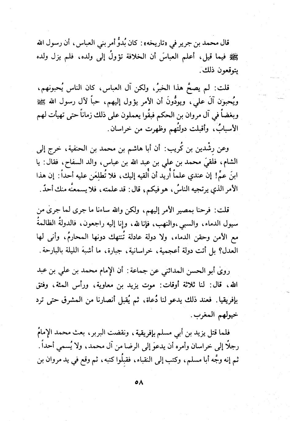 قُلْتُ: لَمْ يَصِحَّ هَذَا الخَبَرُ، وَلَكِنَّ آلَ العَبَّاسِ كَانَ النَّاسُ يُحِبُّونَهُم، وَيُحِبُّوْنَ آلَ عَلِيٍّ، وَيَوَدُّوْنَ أَنَّ الأَمْرَ يَؤُولُ إِلَيْهِم؛ حُبّاً لآلِ رَسُوْلِ اللهِ - صَلَّى اللَّهُ عَلَيْهِ وَسَلَّمَ - وَبُغْضاً فِي آلِ مَرْوَانَ بنِ الحَكَمِ، فَبَقُوا يَعْمَلُوْنَ عَلَى ذَلِكَ زَمَاناً حَتَّى تَهَيَّأَتْ لَهُمُ الأَسبَابُ، وَأَقبَلَتْ دَوْلَتُهُم، وَظَهَرَتْ مِنْ خُرَاسَانَ.