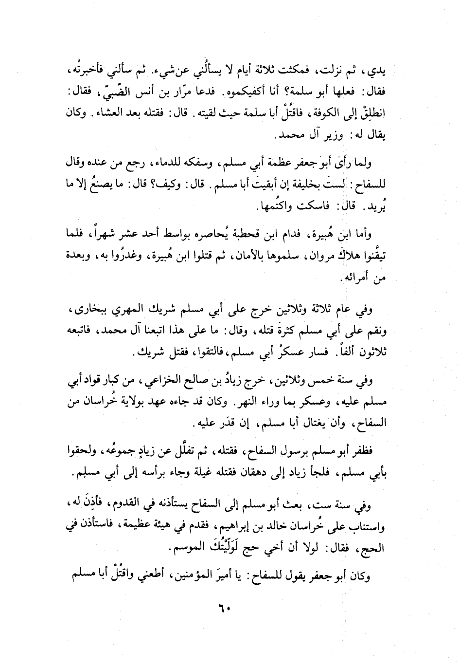 وَلَمَّا رَأَى أَبُو جَعْفَرٍ عَظَمَةَ أَبِي مُسْلِمٍ، وَسَفْكَه لِلدِّمَاءِ، رَجَعَ مِنْ عِنْدِه، وَقَالَ لِلسَّفَّاحِ: لَسْتَ بِخَلِيْفَةٍ إِنْ أَبْقَيْتَ أَبَا مُسْلِمٍ.