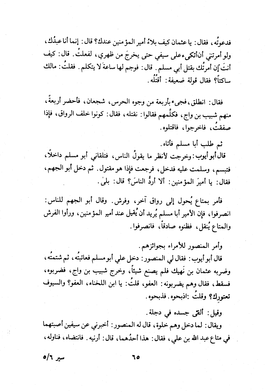 قَالَ أَبُو أَيُّوْبَ: فَقَالَ لِي المَنْصُوْرُ: دَخَلَ عَلِيَّ أَبُو مُسْلِمٍ، فَعَاتَبْتُهُ، ثُمَّ شَتمتُهُ، وَضَرَبَه عُثْمَانُ بنُ نَهِيْكٍ، فَلَمْ يَصْنَعْ شَيْئاً، وَخَرَجَ شَبِيْبُ بنُ وَاجٍ، فَضَربُوْهُ، فَسَقَطَ، فَقَالَ وَهُم يَضْربُوْنَهُ: العَفْوَ.