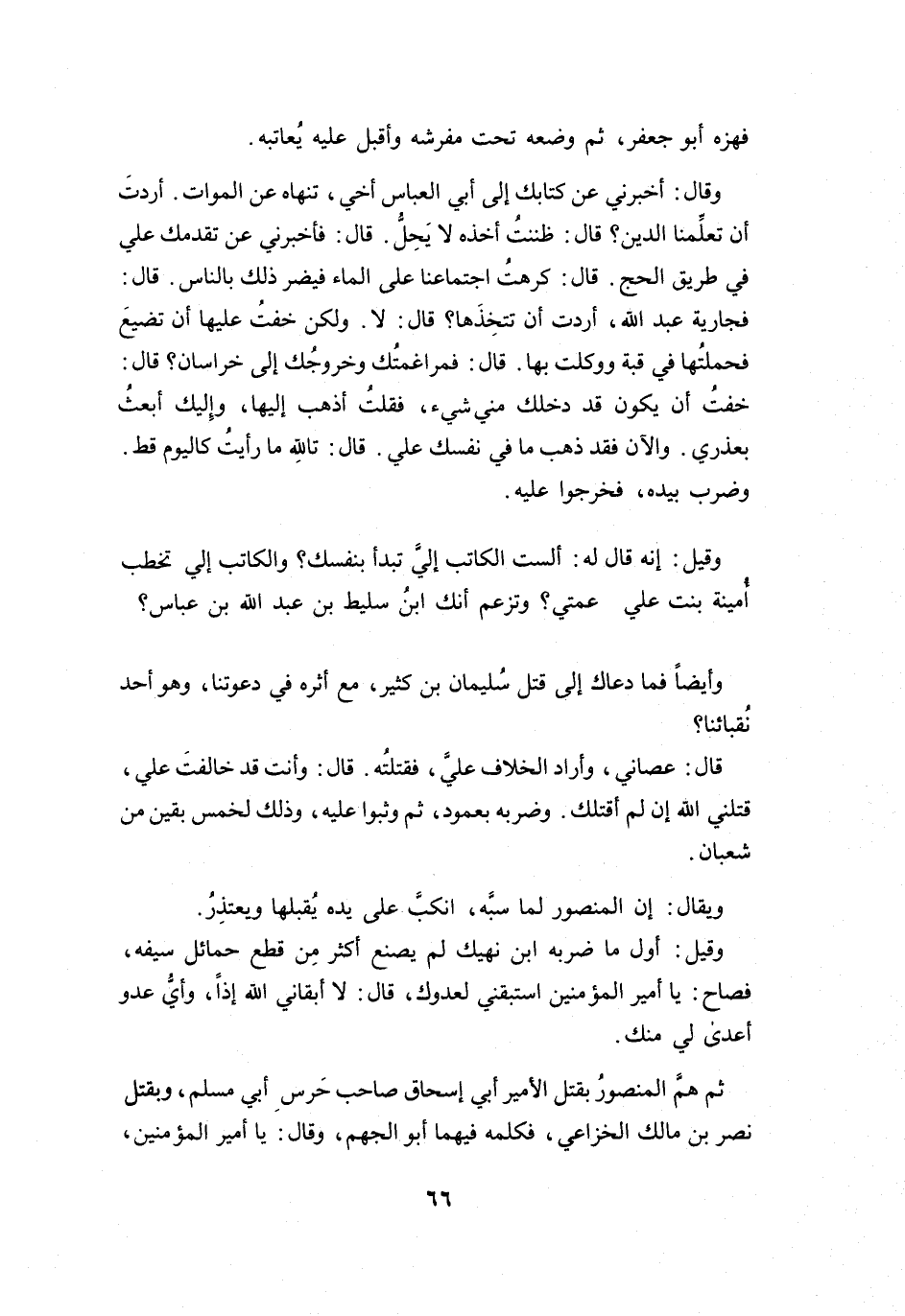 وَقِيْلَ: إِنَّهُ قَالَ لَهُ: أَلستَ الكَاتِبَ إِلَيَّ، تَبدَأُ بِنَفْسِكَ؟ وَالكَاتِبَ إِلَيَّ تَخطُبُ أُمَيْنَةَ بِنْتَ عَلِيٍّ عَمَّتِي؟ وَتَزْعُمُ أَنَّكَ ابْنُ سَلِيْطِ بنِ عَبْدِ اللهِ بنِ عَبَّاسٍ؟ وَأَيضاً، فَمَا دعَاكَ إِلَى قَتْلِ سُلَيْمَانَ بنِ كَثِيْرٍ، مَعَ أَثرِهِ فِي دَعوتِنَا، وَهُوَ أَحَدُ نُقبَائِنَا؟