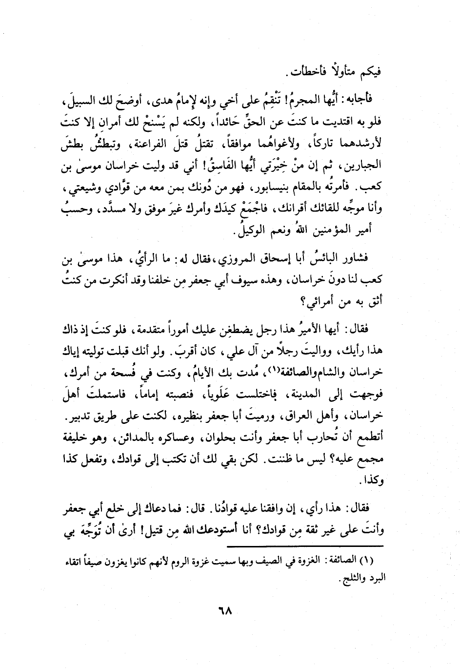 فَقَالَ: أَيُّهَا الأَمِيْرُ! هَذَا رَجُلٌ يَضطغِنُ عَلَيْكَ أُمُوْراً مُتَقَدِّمَةً، فَلَوْ كُنْتَ إِذْ ذَاكَ هَذَا رَأْيُكَ، وَوَالَيتَ رَجُلاً مِنْ آلِ عَلِيٍّ، كَانَ أَقْرَبَ، وَلَوْ أَنَّكَ قَبِلتَ تَوْلِيَتَه إِيَّاكَ خُرَاسَانَ وَالشَّامَ وَالصَّائِفَةَ (1) مُدَّتْ بِكَ الأَيَّامُ، وَكُنْتَ فِي فُسحَةٍ مِنْ أَمرِكَ، فَوَجَّهتَ إِلَى المَدِيْنَةِ، فَاختلستَ عَلَوِيّاً، فَنصَّبتَهُ إِمَاماً، فَاسْتملتَ أَهْلَ خُرَاسَانَ، وَأَهْلَ العِرَاقِ، وَرَمَيتَ أَبَا جَعْفَرٍ بِنَظِيْرِه، لَكُنتَ عَلَى طَرِيْقِ تَدبِيْرٍ، أَتطمعُ أَنْ تُحَاربَ أَبَا جَعْفَرٍ وَأَنْتَ بِحُلْوَانَ، وَعَسَاكِرُه بِالمَدَائِنِ، وَهُوَ خَلِيْفَةٌ مُجمَعٌ عَلَيْهِ؟ لَيْسَ مَا ظَنَنْتَ، لَكِنْ بَقِيَ لَكَ أَنْ تَكْتُبَ إِلَى قُوَّادِكَ، وَتَفْعَلَ كَذَا وَكَذَا.