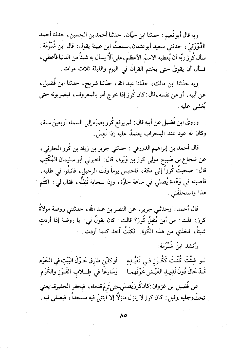 عَنْ فُضَيْلِ بنِ غَزْوَانَ: كَانَ كُرْزٌ يُصَلِّي حَتَّى تَرِمَ قَدَمَاهُ، فَيَحفِرُ الحُفَيرَةَ -يَعْنِي: تَحْتَ رِجْلَيْهِ-.