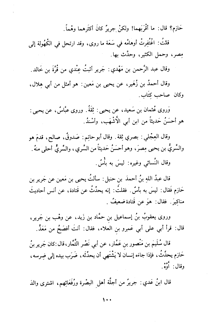 قَالَ عَبْدُ اللهِ بنُ أَحْمَدَ بنِ حَنْبَلٍ: سَأَلْتُ يَحْيَى بنَ مَعِيْنٍ عَنْ جَرِيْرِ بنِ حَازِمٍ، فَقَالَ: لَيْسَ بِهِ بَأْسٌ.