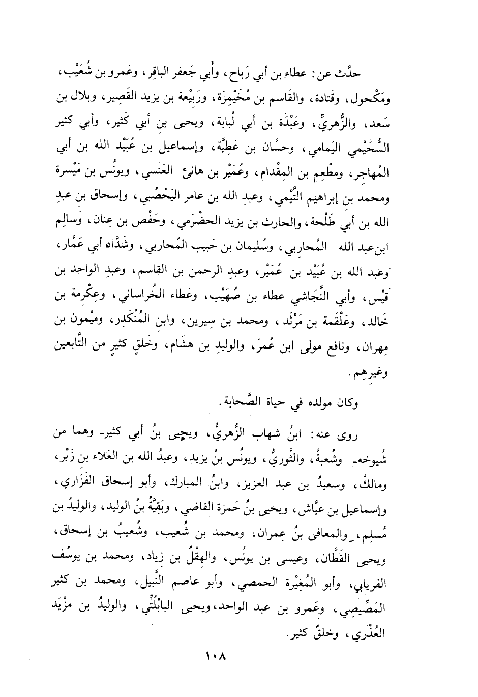 حَدَّثَ عَنْ: عَطَاءِ بنِ أَبِي رَبَاحٍ، وَأَبِي جَعْفَرٍ البَاقِرِ، وَعَمْرِو بنِ شُعَيْبٍ، وَمَكْحُوْلٍ، وَقَتَادَةَ، وَالقَاسِمِ بنِ مُخَيْمِرَةَ، وَرَبِيْعَةَ بنِ يَزِيْدَ القَصِيْرِ، وَبِلاَلِ بنِ سَعْدٍ، وَالزُّهْرِيِّ، وَعَبْدَةَ بنِ أَبِي لُبَابَةَ، وَيَحْيَى بنِ أَبِي كَثِيْرٍ، وَأَبِي كَثِيْرٍ السُّحَيْمِيِّ اليَمَامِيِّ، وَحَسَّانِ بنِ عَطِيَّةَ، وَإِسْمَاعِيْلَ بنِ عُبَيْدِ بنِ أَبِي المُهَاجِرِ، وَمُطْعِمِ بنِ المِقْدَامِ، وَعُمَيْرِ بنِ هَانِئ العَنْسِيِّ، وَيُوْنُسَ بنِ مَيْسَرَةَ، وَمُحَمَّدِ بنِ إِبْرَاهِيْمَ التَّيْمِيِّ، وَعَبْدِ اللهِ بنِ عَامِرٍ اليَحْصُبِيِّ، وَإِسْحَاقَ بنِ عَبْدِ اللهِ بنِ أَبِي طَلْحَةَ، وَالحَارِثِ بنِ يَزِيْدَ الحَضْرَمِيِّ، وَحَفْصِ بنِ عِنَانَ، وَسَالِمِ بنِ عَبْدِ اللهِ المُحَارِبِيِّ، وَسُلَيْمَانَ بنِ حَبِيْبٍ المُحَارِبِيِّ، وَشَدَّادٍ أَبِي عَمَّارٍ، وَعَبْدِ اللهِ بنِ عُبَيْدِ بنِ عُمَيْرٍ، وَعَبْدِ الرَّحْمَنِ بنِ القَاسِمِ، وَعَبْدِ الوَاحِدِ بنِ قَيْسٍ، وَأَبِي النَّجَاشِيِّ عَطَاءِ بنِ صُهَيْبٍ، وَعَطَاءٍ الخُرَاسَانِيِّ، وَعِكْرِمَةَ بنِ خَالِدٍ، وَعَلْقَمَةَ بنِ مَرْثَدٍ، وَمُحَمَّدِ بنِ سِيْرِيْنَ، وَابْنِ المُنْكَدِرِ، وَمَيْمُوْنِ بنِ مِهْرَانَ، وَنَافِعٍ مَوْلَى ابْنِ عُمَرَ، وَالوَلِيْدِ بنِ هِشَامٍ، وَخَلْقٍ كَثِيْرٍ مِنَ التَّابِعِيْنَ، وَغَيْرِهِم.