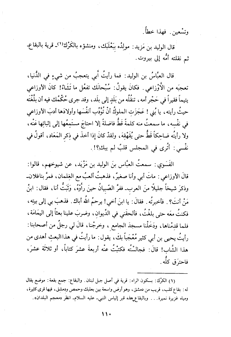 سُبْحَانَكَ، تَفْعَلُ مَا تَشَاءُ! كَانَ الأَوْزَاعِيُّ يَتِيْماً فَقِيْراً فِي حَجْرِ أُمِّهِ، تَنقُلُهُ مِنْ بَلَدٍ إِلَى بَلَدٍ، وَقَدْ جَرَى حُكْمُكَ فِيْهِ أَنْ بَلَّغْتَه حَيْثُ رَأَيتُه، يَا بُنَيَّ! عَجَزَتِ المُلُوْكُ أَنْ تُؤَدِّبَ نَفْسَهَا وَأَوْلاَدَهَا أَدَبَ الأَوْزَاعِيِّ فِي نَفْسِهِ، مَا سَمِعْتُ مِنْهُ كَلِمَةً قَطُّ فَاضِلَةً إِلاَّ احْتَاجَ مُسْتَمِعُهَا إِلَى إِثْبَاتِهَا عَنْهُ، وَلاَ رَأَيتُهُ ضَاحِكاً قَطُّ حَتَّى يُقَهْقِهَ، وَلقَدْ كَانَ إِذَا أَخَذَ فِي ذِكْرِ المَعَادِ، أَقُوْلُ فِي نَفْسِي: أَتُرَى فِي المَجْلِسِ قَلْبٌ لَمْ يَبْكِ؟!