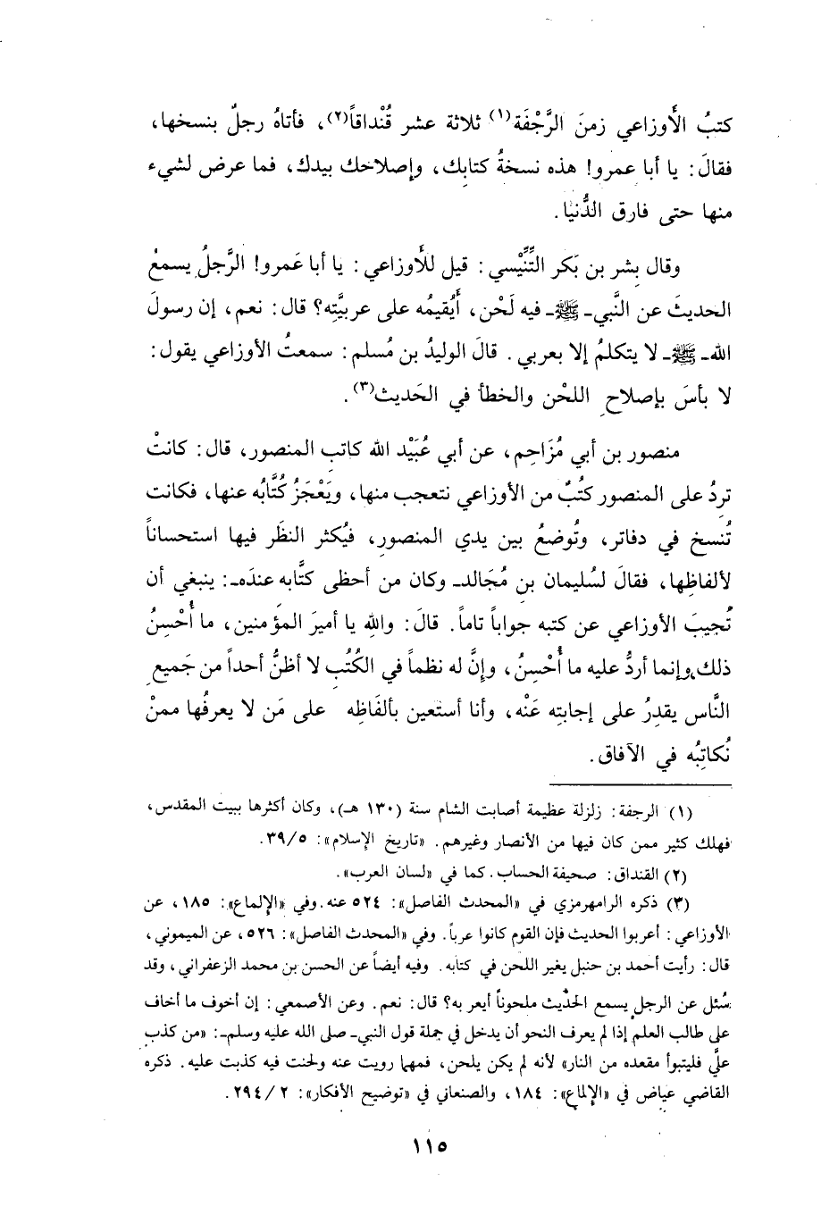 قَالَ الوَلِيْدُ بنُ مُسْلِمٍ: سَمِعْتُ الأَوْزَاعِيَّ يَقُوْلُ: لاَ بَأْسَ بِإِصلاَحِ اللَّحْنِ وَالخَطَأِ فِي الحَدِيْثِ (3) .