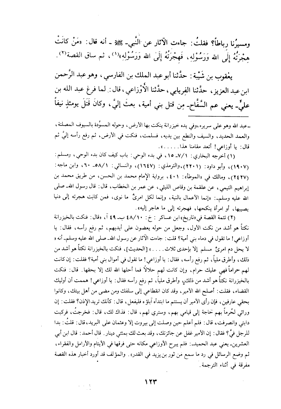(2) تتمة القصة في " تاريخ " ابن عساكر: خ: 10 / 48 ب - 49 آ، " قال: فنكت بالخيزرانة نكتا هو أشد من نكت الأول، وجعل من حوله يعضون على أيديهم، ثم رفع رأسه، فقال: يا أوزاعي! ما تقول في دماء بني أمية؟ قلت: جاءت الآثار عن رسول الله - صلى الله عليه وسلم - أنه " لا يحل دم امرئ مسلم إلا بإحدى ثلاث ... " [الحديث] ، فنكت بالخيزرانة نكتا هو أشد من ذلك، وأطرق مليا، ثم رفع رأسه، فقال: يا أوزاعي! ما تقول في أموال بني أمية؟ فقلت: إن كانت لهم حراما فهي عليك حرام، وإن كانت لهم حلالا فما أحلها الله لك إلا بحقها.