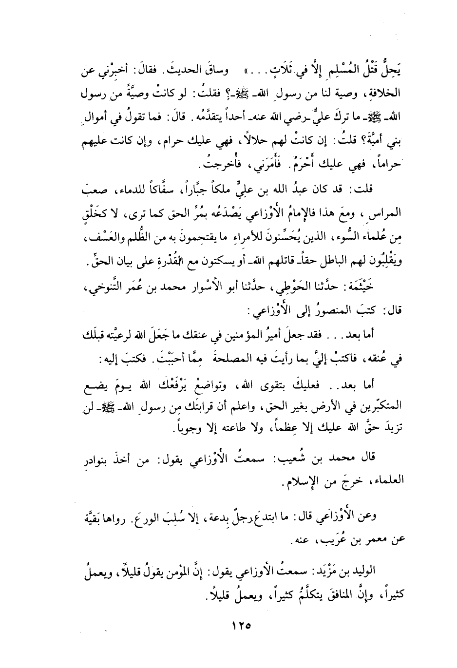 كَتَبَ المَنْصُوْرُ إِلَى الأَوْزَاعِيِّ: أَمَّا بَعْدُ، فَقَدْ جَعَلَ أَمِيْرُ المُؤْمِنِيْنَ فِي عُنُقِكَ مَا جَعَلَ اللهُ لِرَعِيَّتِهِ قَبْلَكَ فِي عُنُقِهِ، فَاكتُبْ إِلَيَّ بِمَا رَأَيتَ فِيْهِ المَصْلَحَةَ مِمَّا أَحْبَبْتَ.