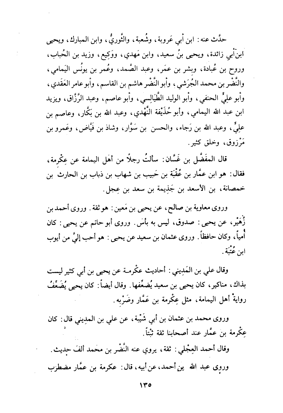 وَقَالَ أَيْضاً: كَانَ يَحْيَى يُضَعِّفُ رِوَايَةَ أَهْلِ اليَمَامَةِ، مِثْلَ عِكْرِمَةَ بنِ عَمَّارٍ، وَضَرْبِهِ.