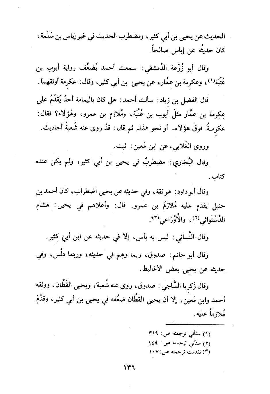 قَالَ: وَأَعْلاَهُم فِي يَحْيَى: هِشَامٌ الدَّسْتُوَائِيُّ (2) ، وَالأَوْزَاعِيُّ (3) .