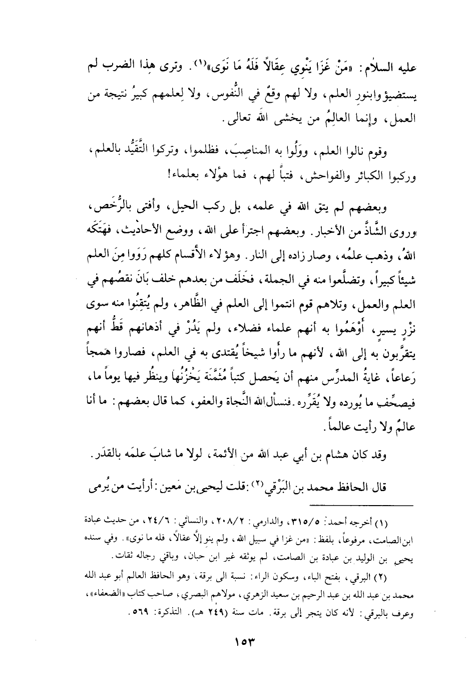 وَتَلاَهُم قَوْمٌ انْتَمَوْا إِلَى العِلْمِ فِي الظَّاهِرِ، وَلَمْ يُتْقِنُوا مِنْهُ سِوَى نَزْرٍ يَسِيْرٍ، أَوْهَمُوا بِهِ أَنَّهُم عُلَمَاءُ فُضَلاَءُ، وَلَمْ يَدُرْ فِي أَذهَانِهِم قَطُّ أَنَّهُم يَتَقَرَّبُوْنَ بِهِ إِلَى اللهِ؛ لأَنَّهُم مَا رَأَوْا شَيْخاً يُقْتَدَى بِهِ فِي العِلْمِ، فَصَارُوا هَمَجاً رَعَاعاً، غَايَةُ المُدَرِّسِ مِنْهُم أَنْ يُحَصِّلَ كُتُباً مُثَمَّنَةً، يَخْزُنُهَا، وَيَنْظُرُ فِيْهَا يَوْماً مَا، فَيُصَحِّفُ مَا يُوْرِدُهُ، وَلاَ يُقَرِّرُهُ.