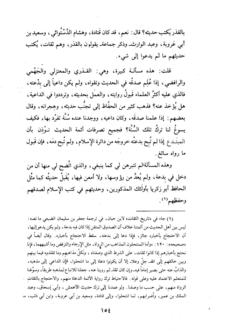 قُلْتُ: هَذِهِ مَسْأَلَةٌ كَبِيْرَةٌ، وَهِيَ: القَدَرِيُّ، وَالمُعْتَزِلِيُّ، وَالجَهْمِيُّ، وَالرَّافِضِيُّ، إِذَا عُلِمَ صِدْقُهُ فِي الحَدِيْثِ وَتَقْوَاهُ، وَلَمْ يَكُنْ دَاعِياً إِلَى بِدْعَتِهِ، فَالَّذِي عَلَيْهِ أَكْثَرُ العُلَمَاءِ قَبُولُ رِوَايَتِهِ، وَالعَمَلِ بِحَدِيْثِهِ، وَتَرَدَّدُوا فِي الدَّاعِيَةِ، هَلْ يُؤْخَذُ عَنْهُ؟