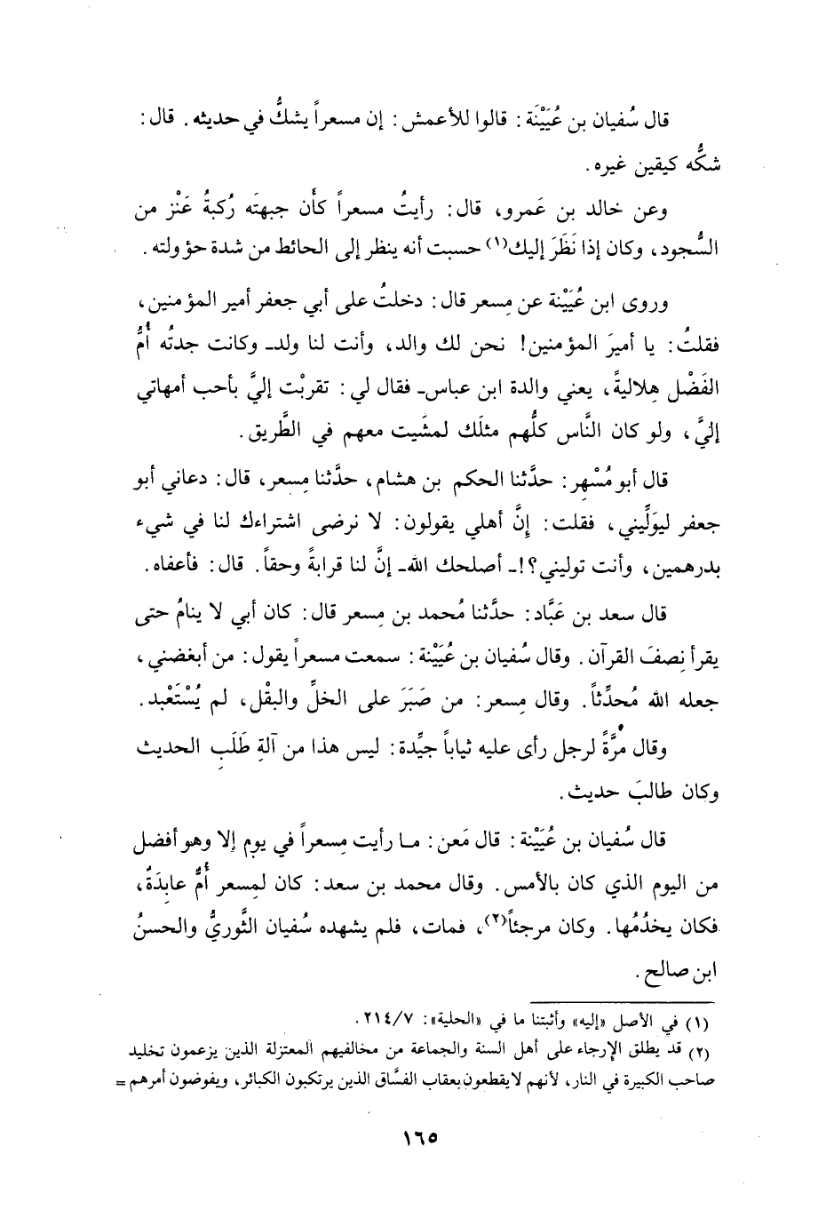 وَقَالَ مُحَمَّدُ بنُ سَعْدٍ: كَانَ لِمِسْعَرٍ أُمٌّ عَابِدَةٌ، فَكَانَ يَخْدُمُهَا، وَكَانَ مُرْجِئاً (2) ، فَمَاتَ، فَلَمْ يَشهَدْهُ سُفْيَانُ الثَّوْرِيُّ، وَالحَسَنُ بنُ صَالِحٍ.