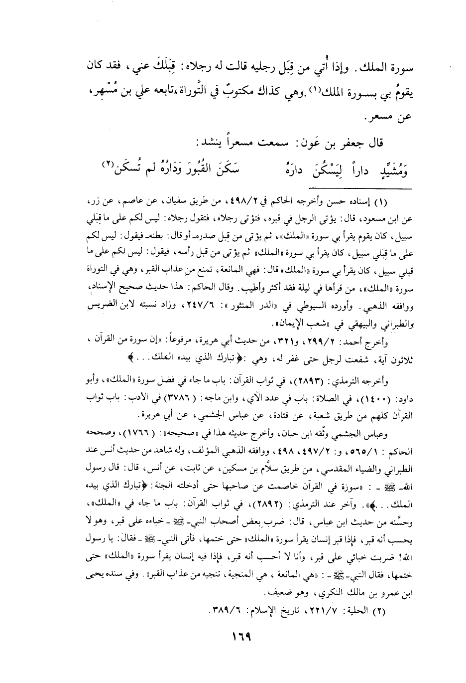 (1) إسناده حسن وأخرجه الحاكم في 2 / 498، من طريق سفيان، عن عاصم، عن زر، عن ابن مسعود، قال: يؤتى الرجل في قبره، فتؤتى رجلاه، فتقول رجلاه: ليس لكم على ما قبلي سبيل، كان يقوم يقرأ بي سورة " الملك "، ثم يؤتى من قبل صدره - أو قال: بطنه - فيقول: ليس لكم على ما قبلي سبيل، كان يقرأ بي سورة " الملك " ثم يؤتى من قبل رأسه، فيقول: ليس لكم على ما قبلي سبيل، كان يقرأ بي سورة " الملك " قال: فهي المانعة، تمنع من عذاب القبر، وهي في التوراة سورة " الملك "، من قرأها في ليلة فقد أكثر وأطيب.