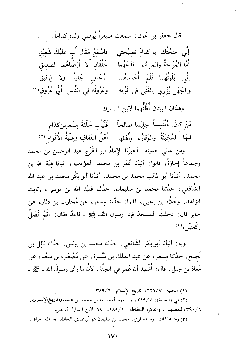 (2) في " الحلية ": 7 / 219، وينسبهما لعبد الله بن محمد بن عبيد، و" تاريخ الإسلام ". 6 / 390، لبعضهم، و" تذكرة الحفاظ ": 1 / 189 - 190، لابن المبارك أو غيره.