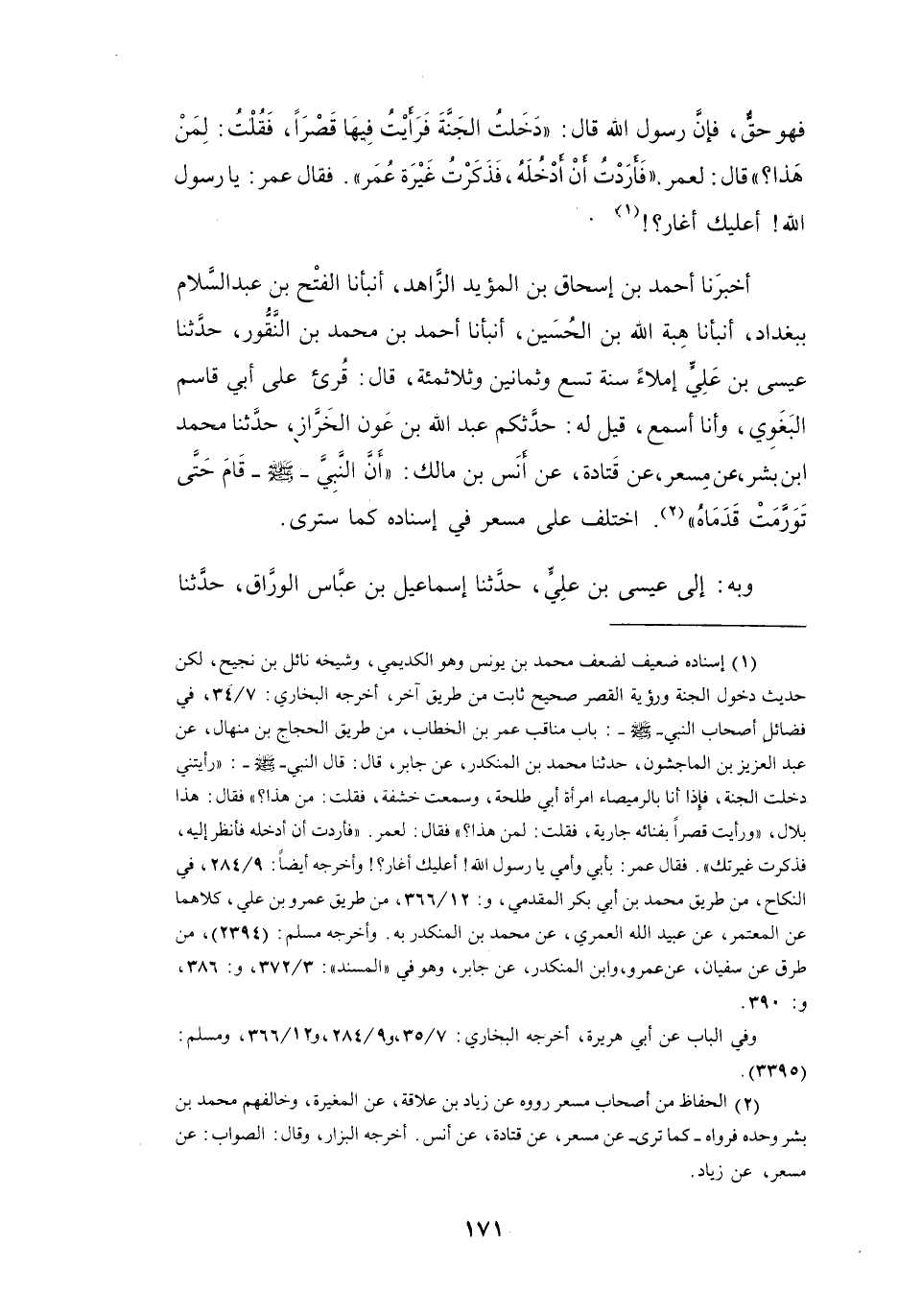 (1) إسناده ضعيف لضعف محمد بن يونس وهو الكديمي، وشيخه نائل بن نجيح، لكن حديث دخول الجنة ورؤية القصر صحيح ثابت من طريق آخر، أخرجه البخاري: 7 / 34، في فضائل أصحاب النبي - صلى الله عليه وسلم -: باب مناقب عمر بن الخطاب، من طريق الحجاج بن منهال، عن عبد العزيز بن الماجشون، حدثنا محمد بن المنكدر، عن جابر، قال: قال النبي - صلى الله عليه وسلم -: " رأيتني دخلت الجنة، فإذا أنا بالرميصاء امرأة أبي طلحة، وسمعت خشفة، فقلت: من هذا؟ " فقال: هذا بلال، و" رأيت قصرا بفنائه جارية، فقلت: لمن هذا؟ " فقال: لعمر " فأردت أن أدخله فأنطر إليه، فذكرت غيرتك ". فقال عمر: بأبي وأمي يا رسول الله! أعليك أغار؟ ! وأخرجه أيضا: 9 / 284، في النكاح، من طريق محمد بن أبي بكر المقدمي، و: 12 / 366، من طريق عمرو بن علي، كلاهما عن المعتمر، عن عبيد الله العمري، عن محمد بن المنكدر به.