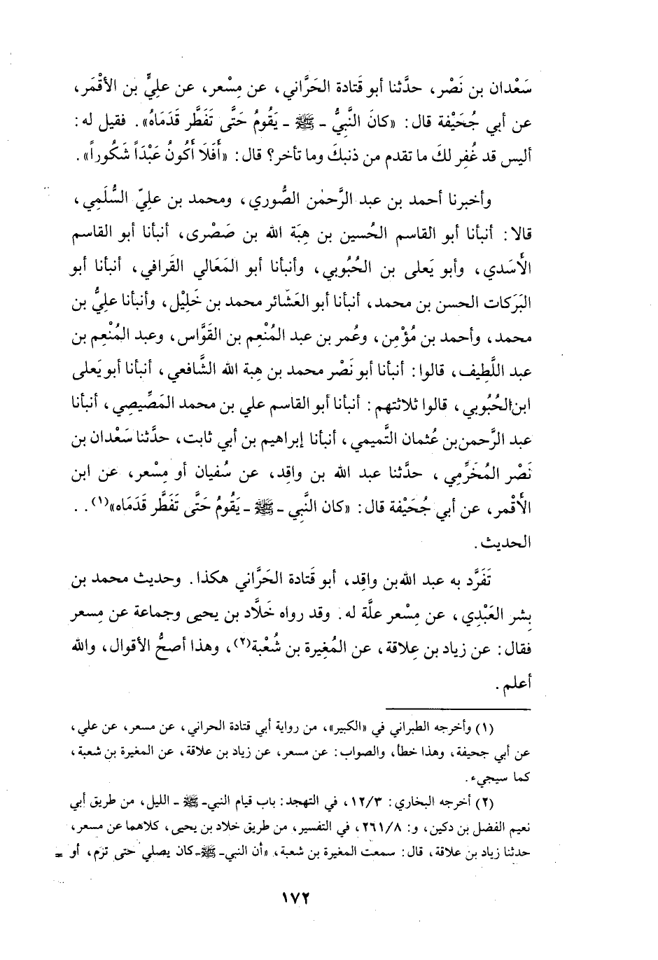 (2) أخرجه البخاري: 3 / 12، في التهجد: باب قيام النبي - صلى الله عليه وسلم - الليل، من طريق أبي نعيم الفضل بن دكين، و: 8 / 261، في التفسير، من طريق خلاد بن يحيى، كلاهما عن مسعر، حدثنا زياد بن علاقة، قال: سمعت المغيرة بن شعبة، " أن النبي - صلى الله عليه وسلم - كان يصلي حتى ترم، أو =