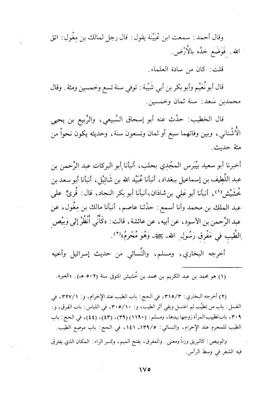 (2) أخرجه البخاري: 3 / 315، في الحج، باب الطيب عند الاحرام، و: 1 / 327، في الغسل: باب من تطيب ثم اغتسل وبقي اثر الطيب، و: 10 / 305، في اللباس: باب الفرق، و: 309، باب تطييب المرأة زوجها بيدها، ومسلم: (1190) (39) ، (43) ، (44) ، في الحج: باب الطيب للمحرم عند الاحرام، والنسائي: 5 / 139 - 141، في الحج: باب موضع الطيب.