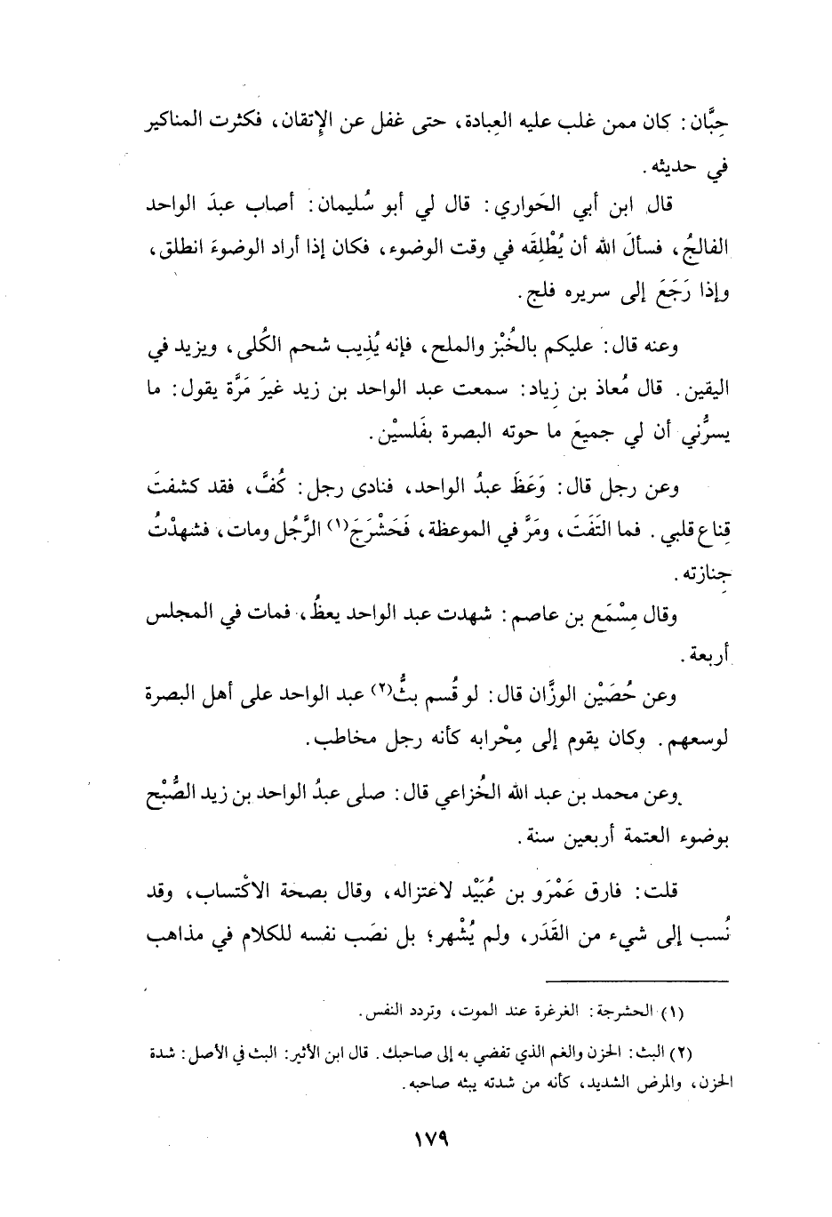 وَعَنْ حُصَيْنٍ الوَزَّانِ، قَالَ: لَوْ قُسِمَ بَثُّ (2) عَبْدِ الوَاحِدِ عَلَى أَهْلِ البَصْرَةِ، لَوَسِعَهُم، وَكَانَ يَقُوْمُ إِلَى مِحْرَابِهِ كَأَنَّهُ رَجُلٌ مُخَاطَبٌ.