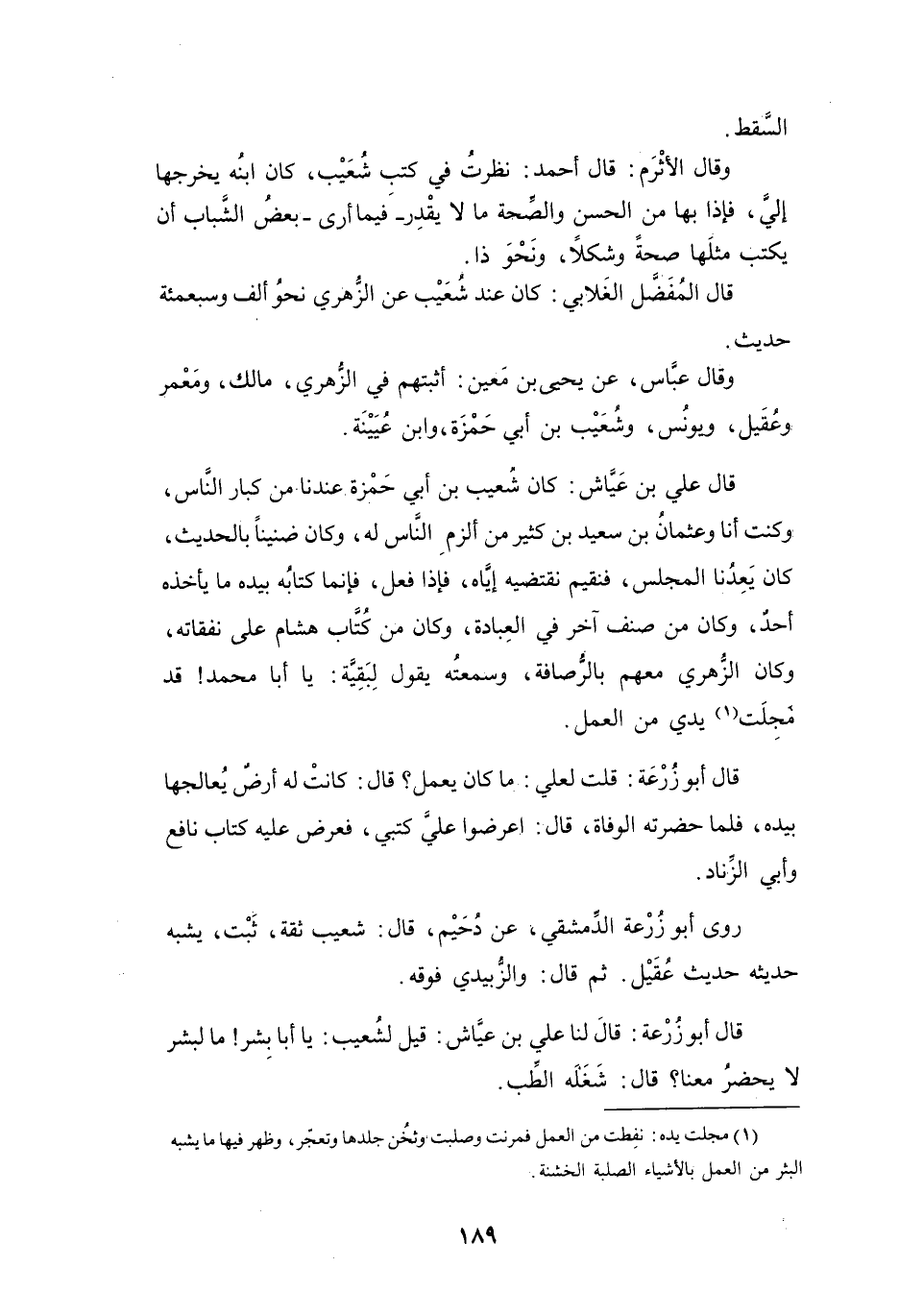 نَظَرْتُ فِي كُتُبِ شُعَيْبٍ، كَانَ ابْنُهُ يُخْرِجُهَا إِلَيَّ، فَإِذَا بِهَا مِنَ الحَسَنِ وَالصِّحَّةِ مَا لاَ يَقْدِرُ - فِيْمَا أَرَى - بَعْضُ الشَّبَابِ أَنْ يَكْتُبَ مِثْلَهَا صِحَّةً وَشَكلاً، وَنَحْوَ ذَا.