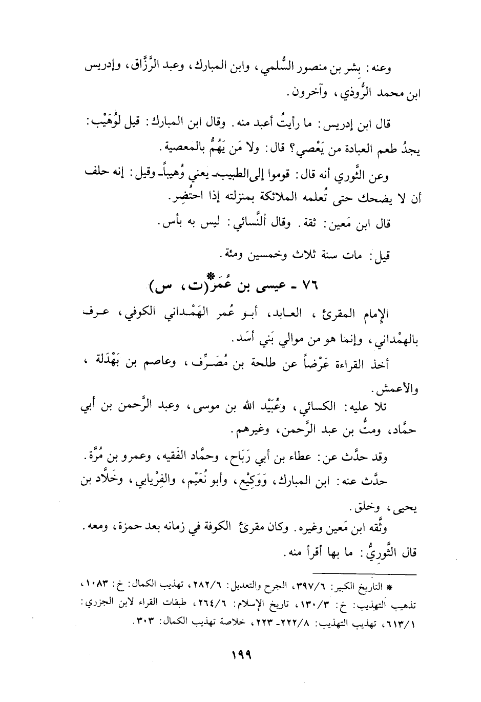 (*) التاريخ الكبير: 6 / 397، الجرح والتعديل: 6 / 282، تهذيب الكمال: خ: 1083، تذهيب التهذيب: خ: 3 / 130، تاريخ الإسلام: 6 / 264، طبقات القراء لابن الجزري: 1 / 613، تهذيب التهذيب: 8 / 222 - 223، خلاصة تهذيب الكمال: 303.