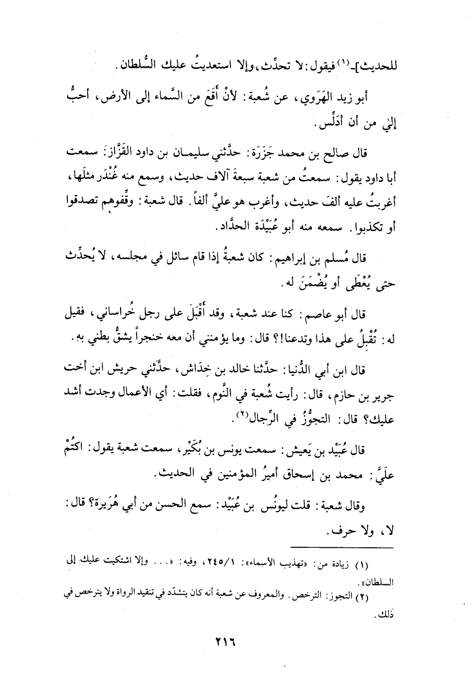 (2) التجوز: الترخص. والمعروف عن شعبة أنه كان يتشدد في تنقيد الرواة ولا يترخص في ذلك.