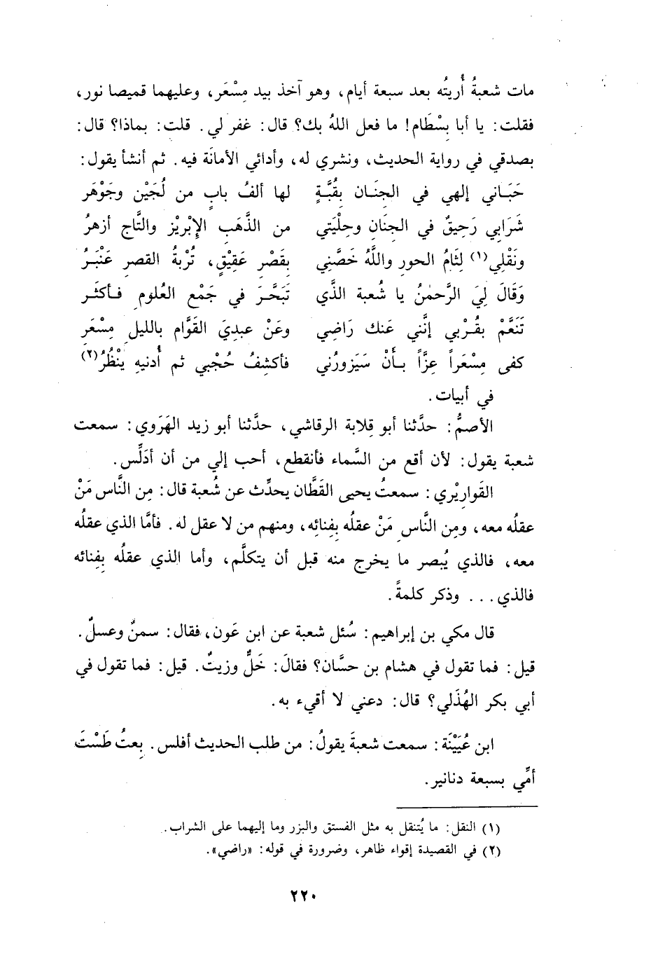 مَاتَ شُعْبَةُ، أُرِيتُهُ بَعْدَ سَبْعَةِ أَيَّامٍ، وَهُوَ آخذٌ بِيَدِ مِسْعَرٍ، وَعَلَيْهِمَا قَمِيْصَا نُوْرٍ، فَقُلْتُ: يَا أَبَا بِسْطَامَ! مَا فَعَلَ اللهُ بِكَ؟