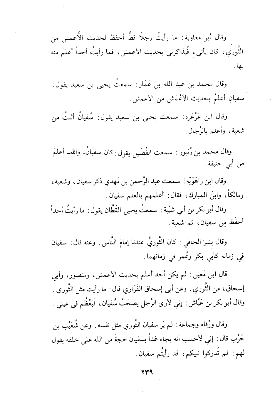قَالَ ابْنُ مَعِيْنٍ: لَمْ يَكُنْ أَحَدٌ أَعْلَمَ بِحَدِيْثِ الأَعْمَشِ، وَمَنْصُوْرٍ، وَأَبِي إِسْحَاقَ، مِنَ الثَّوْرِيِّ.