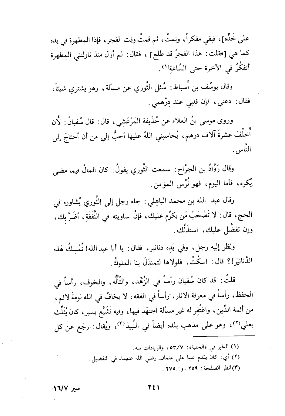 قَالَ: قَدْ كَانَ سُفْيَانُ رَأْساً فِي الزُّهدِ، وَالتَّأَلُّهِ، وَالخَوْفِ، رَأْساً فِي الحِفْظِ، رَأْساً فِي مَعْرِفَةِ الآثَارِ، رَأْساً فِي الفِقْهِ، لاَ يَخَافُ فِي اللهِ لَوْمَةَ لاَئِمٍ مِنْ أَئِمَّةِ الدِّيْنِ، وَاغْتُفِرَ لَهُ غَيْرُ مَسْأَلَةٍ اجْتَهَدَ فِيْهَا، وَفِيْهِ تَشَيُّعٌ يَسِيْرٌ، كَانَ يُثَلِّثُ بِعَلِيٍّ (2) ، وَهُوَ عَلَى مَذْهَبِ بَلَدِهِ أَيْضاً فِي النَّبِيذِ (3) . وَيُقَالُ: رَجَعَ عَنْ كُلِّ