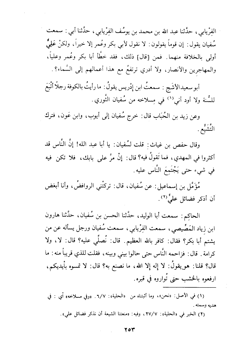 الحَاكِمُ: سَمِعْتُ أَبَا الوَلِيْدِ، حَدَّثَنَا الحَسَنُ بنُ سُفْيَانَ، حَدَّثَنَا هَارُوْنُ بنُ زِيَادٍ المَصِّيْصِيُّ، سَمِعْتُ الفِرْيَابِيَّ، سَمِعْتُ سُفْيَانَ، وَرَجُلٌ يَسْأَلُهُ عَنْ مَنْ يَشتُمُ أَبَا بَكْرٍ، فَقَالَ: كَافِرٌ بِاللهِ العَظِيْمِ.