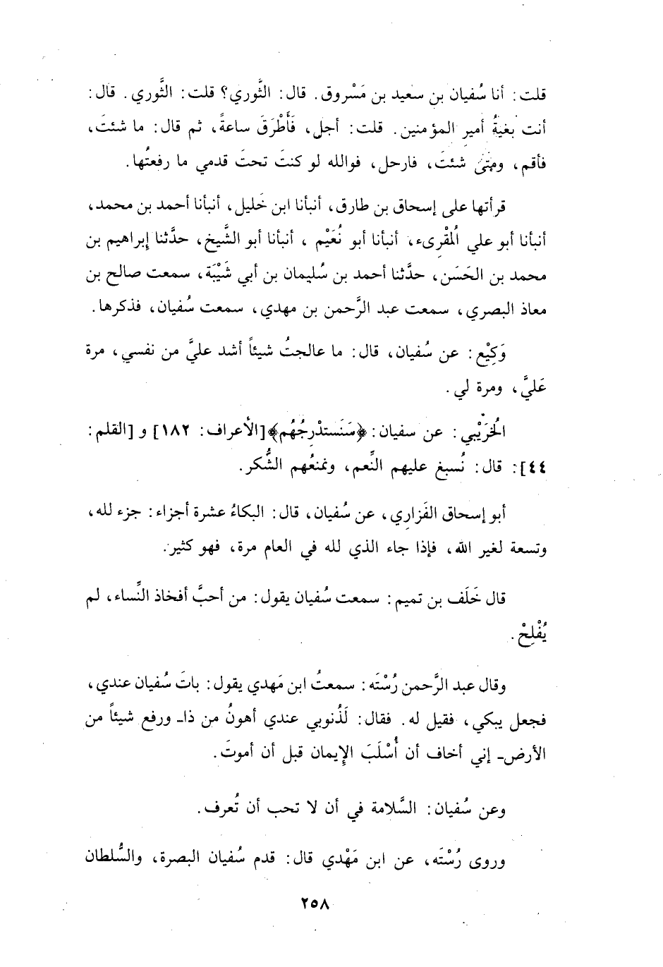 قَرَأْتُهَا عَلَى إِسْحَاقَ بنِ طَارِقٍ، أَنْبَأَنَا ابْنُ خَلِيْلٍ، أَنْبَأَنَا أَحْمَدُ بنُ مُحَمَّدٍ، أَنْبَأَنَا أَبُو عَلِيٍّ المُقْرِئُ، أَنْبَأَنَا أَبُو نُعَيْمٍ، أَنْبَأَنَا أَبُو الشَّيْخِ، حَدَّثَنَا إِبْرَاهِيْمُ بنُ مُحَمَّدِ بنِ الحَسَنِ، حَدَّثَنَا أَحْمَدُ بنُ سُلَيْمَانَ بنِ أَبِي شَيْبَةَ، سَمِعْتُ صَالِحَ بنَ مُعَاذٍ البَصْرِيَّ، سَمِعْتُ عَبْدَ الرَّحْمَنِ بنَ مَهْدِيٍّ، سَمِعْتُ سُفْيَانَ ... ، فَذَكَرَهَا.