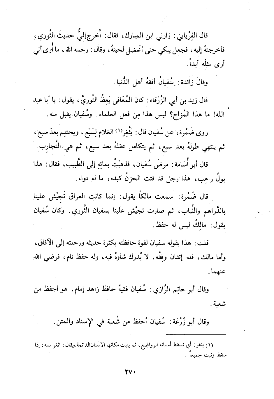 وَقَالَ أَبُو حَاتِمٍ الرَّازِيُّ: سُفْيَانُ فَقِيْهٌ، حَافِظٌ، زَاهِدٌ، إِمَامٌ، هُوَ أَحْفَظُ مِنْ شُعْبَةَ.